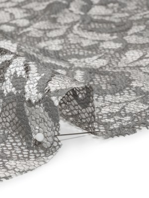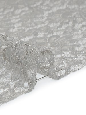 Stretch Raschel Lace with Finished Scalloped Edges – Luminous Silver and Gray Flowers, Leaves and Swirls – Crina Collection