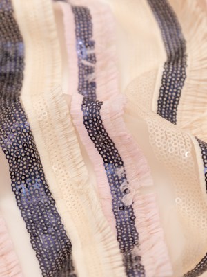 Italian Novelty Pale Beige and Pink Sequins and Fringe Striped Tulle