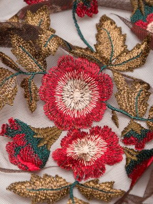 Italian Red, Gold and Green Metallic Floral Embroidery on Brown Tulle with Finished Edges