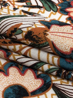 Slubbed Viscose Woven Print – Mustard and Terracotta Floral and Zig Zag – Mood Exclusive Retro Blossoms