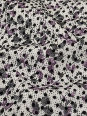 Black Flocked Polka Dots on Dark Gray and Purple Leaves and Dots Stretch Cotton Shirting