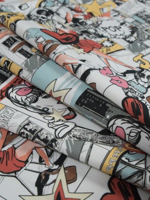 Stretch Cotton Sateen – Red and Yellow Comics – Coffee and Cars Print – Mood Exclusive Comic Collection