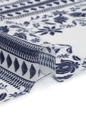 Crinkled Cotton Gauzy Woven Panel – White and Navy Blue Big Floral Embroidery Squares – Mood Exclusive Porcelain Petals Print