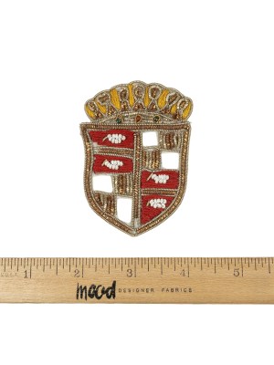Vintage Metallic Gold and Red Diamond Crest Bullion Embroidered and Beaded Applique – 2.75″ x 2.5″