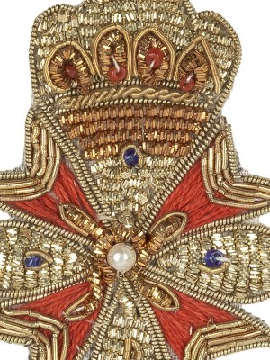 Vintage Gold, Red and Blue Coat of Arms Bullion Embroidered and Beaded Applique – 3″ x 2″