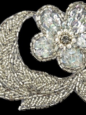 Vintage White Iris Sequins and Silver Bugle Beaded Floral Applique – 4.75″ x 3.75″
