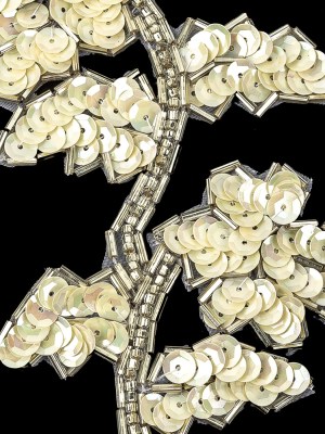 Vintage Ivory Iris Sequins and Silver Bugle Beaded Floral Applique – 4.75″ x 3.75″