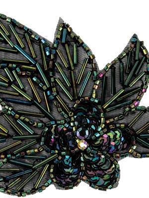 Vintage Gunmetal Sequins and Iridescent Chop Beaded Leaf Applique – 3.75″ x 1.75″