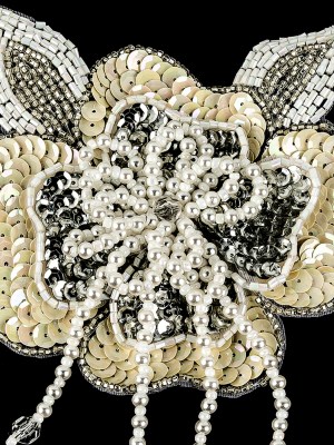 Vintage Pearl and White Iris Beaded and Sequins Applique with Crystal Rhinestone Center – 8.25″ x 4.875″